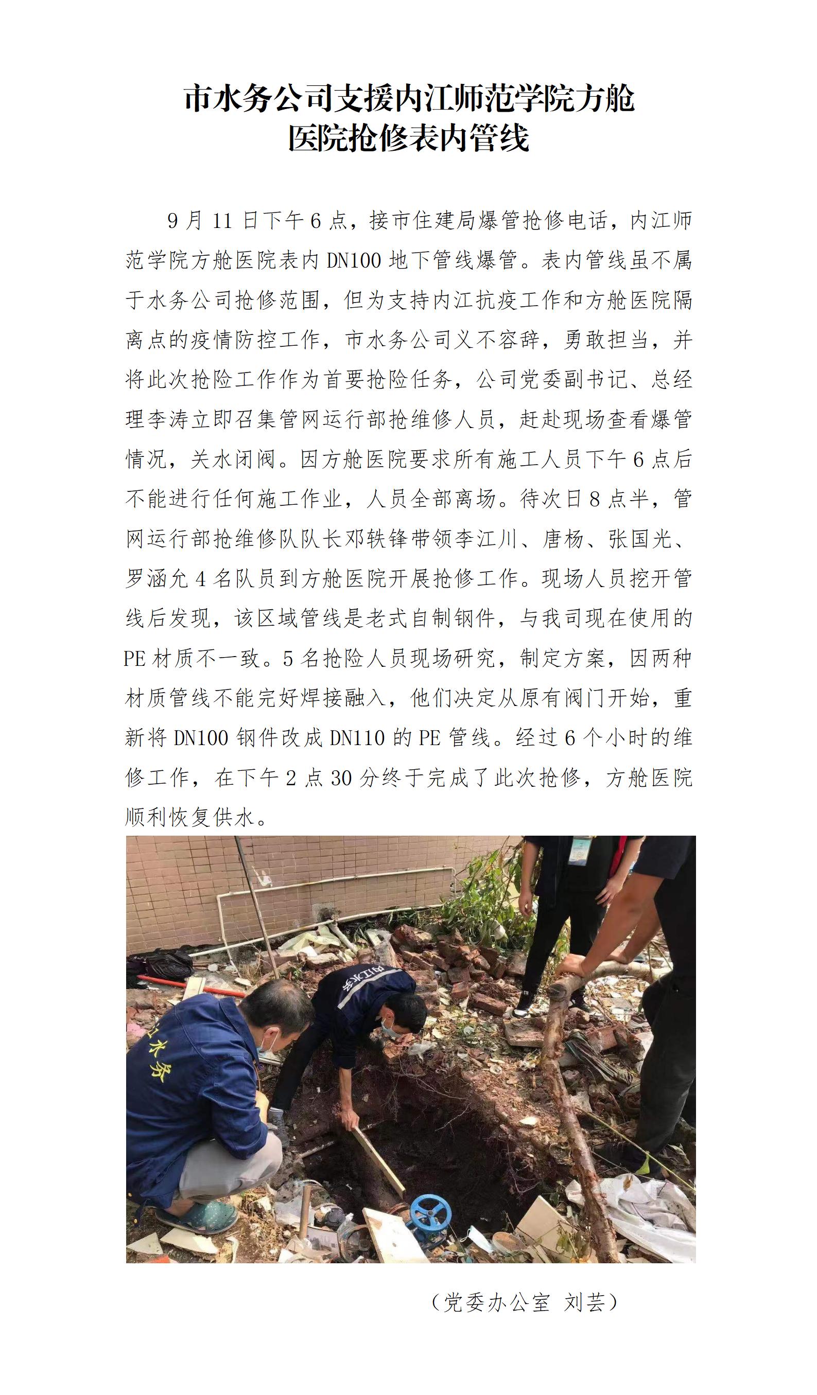 市水務(wù)公司支援內(nèi)江師范學院方艙 醫(yī)院搶修表內(nèi)管線