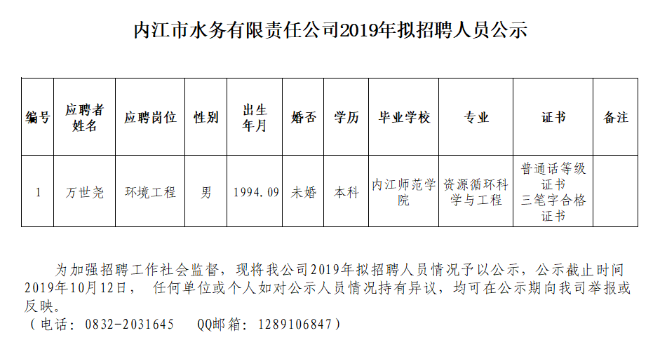 內江市水務有限責任公司2019年擬招聘人員公示