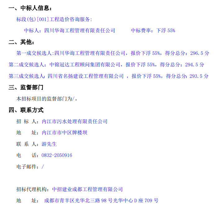 內江市第二污水處理廠二期工程造價咨詢服務項目中標結果公示