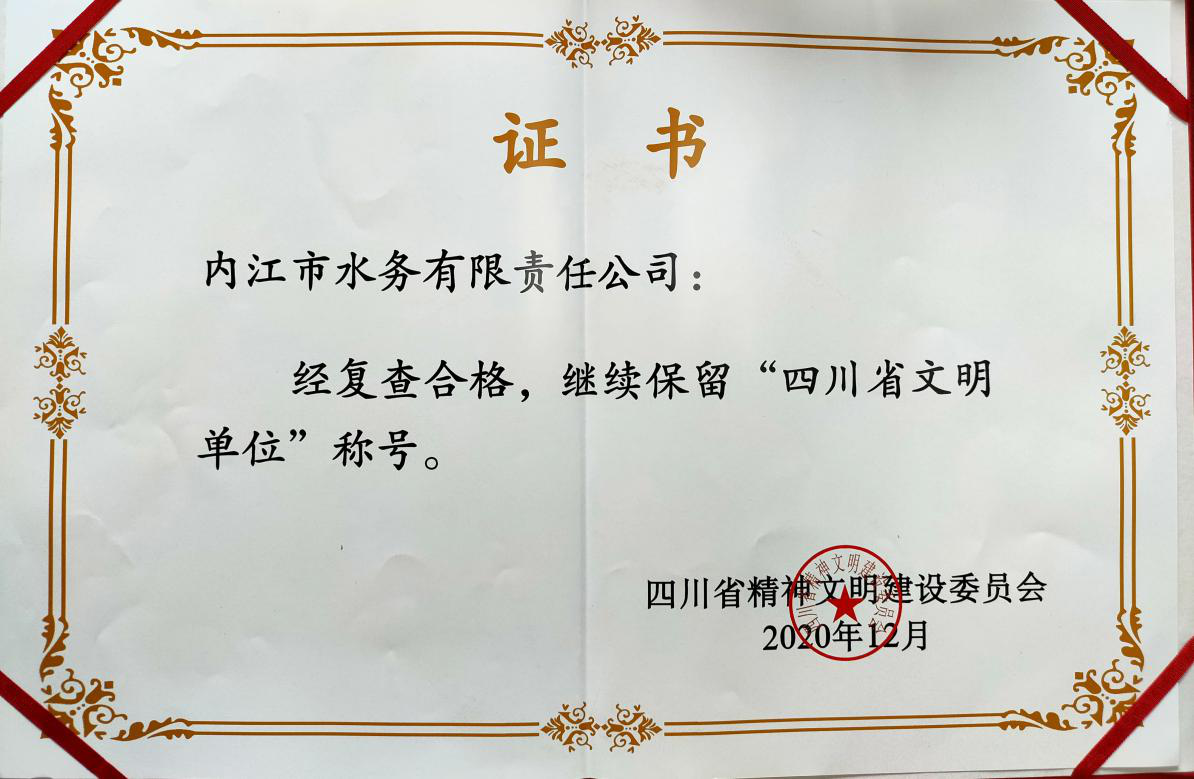 近年來,市水務公司黨委始終以*新時代中國特色社會主義思想為指導,推進精神文明建設工作不松勁,抓好生產經營工作促發展,推動公司精神文明和物質文明建設的雙豐收。根據四川省精神文明建設委員會《關于復查確認繼續保留稱號的四川省文明城市、文明村鎮、文明單位、文明家庭、文明校園的通報》(川文明委〔2020〕20號),內江市水務有限責任公司順利通過復查,繼續保留“四川省文明單位”榮譽稱號。